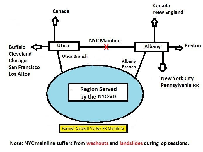 The Valley Division of the New York Central System serves the upstate New York region originally handled by the Catskill Valley Railroad until 1849. The NYC's heavily-used four-track Water Level Route ("You can sleep!") mainline along the Mohawk River frequently experiences washouts or landslides from heavy rainstorms. No alternate routing exists. The Valley Division of the NYC, somewhat "off the beaten track" from the primary mainline between New York City and Buffalo, remains an important back-up route for cross-state passenger and freight traffic. Local customers on the Valley Division include extensive dairy farming and creamery operations, logging and sawmill industries, petroleum refining, coal extraction, a steel mill and numerous smaller supporting companies. The NYC Valley Division provides transfer of freight between many local industries with interchanges at Albany and Utica. It also has extensive local passenger service to the many hamlets of the Catskill mountains and valleys.