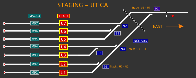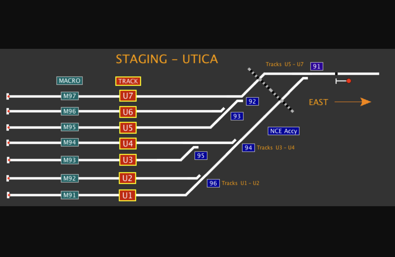 This track diagram illustrates the UTICA staging yard which can hold seven full-length trains of 25 cars each with the locomotive. This staging yard is located in an adjacent area to the layout room and is entered via a small hole through the wall affectionately called a “mousehole”. The other staging yard, ALBANY, is also in a separate room and is entered via a different “mousehole”. Running trains through mouseholes is a delicate task since visibility to the other side of the mousehole is impossible. Dependence on signals and a capable Stagemaster is needed for successful operation. Turnouts in both staging yards are controlled by wireless NCE cabs using macros.