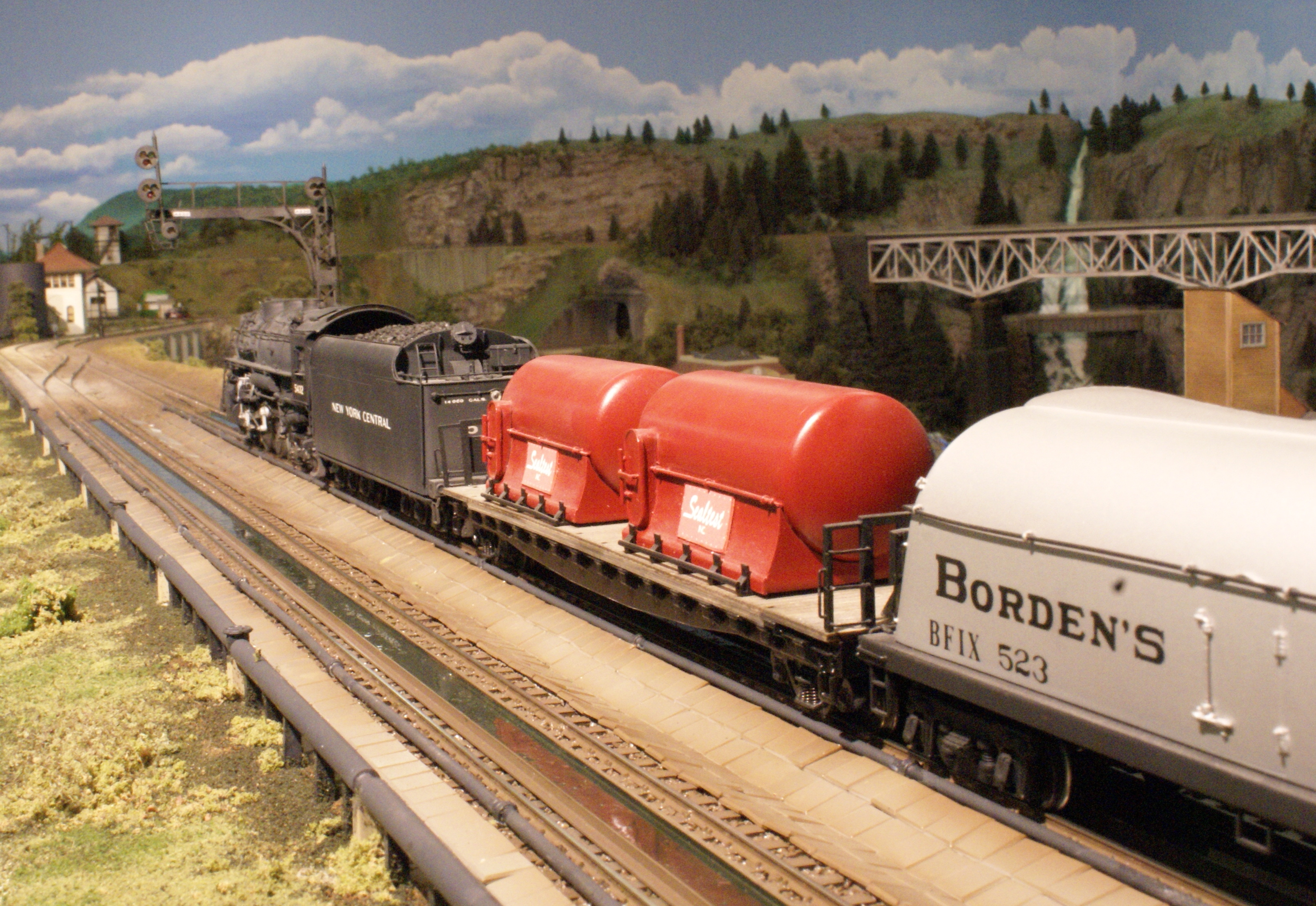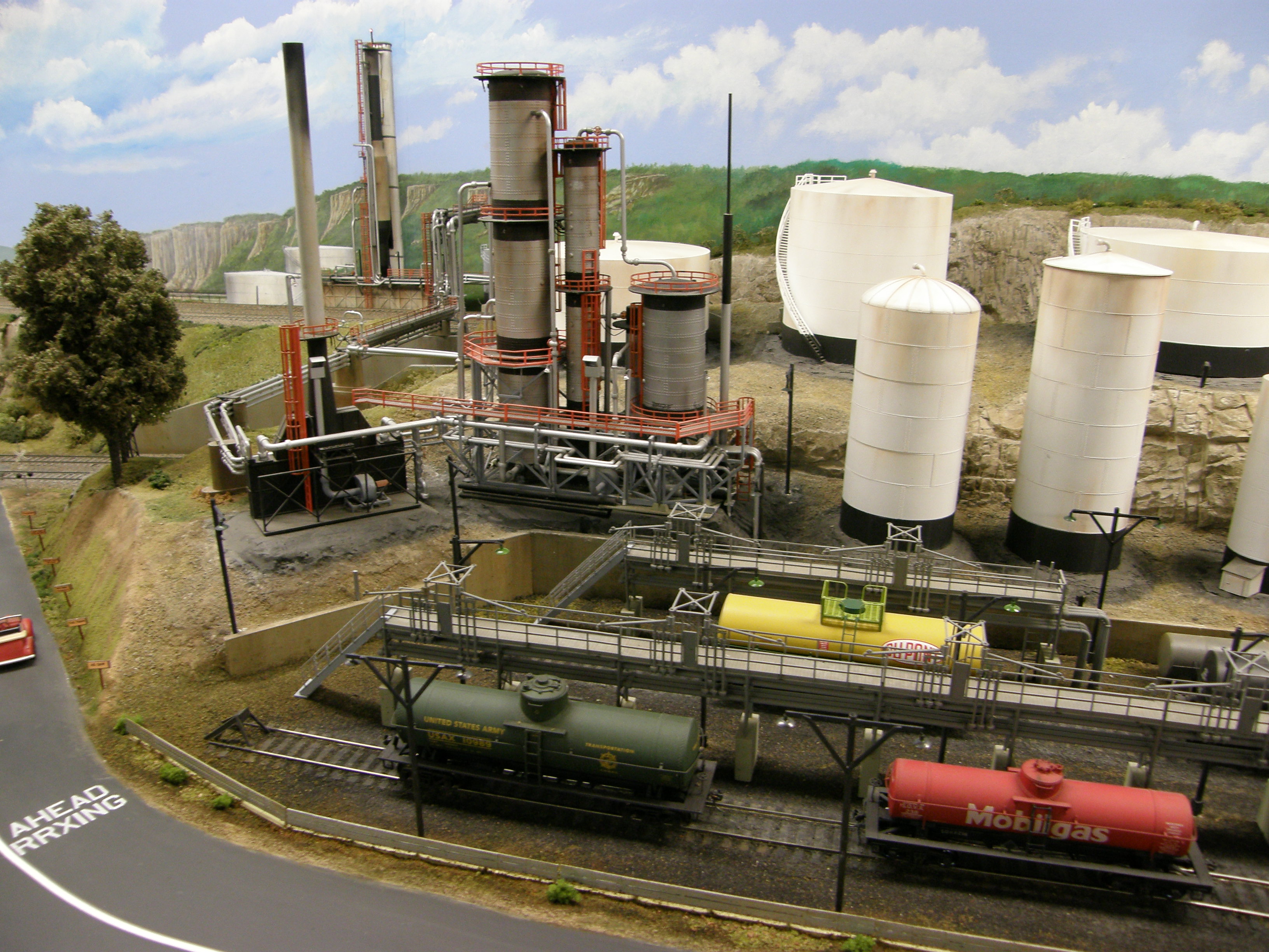 Petroleum refining requires a lot of space and specialized equipment. Not to mention extensive piping to move crude oil from a ship to storage tanks to refining processes to more storage tanks to railroad cars for distribution. Notice the Hudson River in the background and the dark brown unloading dock where the land journey begins. Tank cars come in all kinds of sizes, dome arrangements and colors. Most of this refinery is constructed from Walther’s HO refinery pieces and parts. It is placed on a hillside to give the impression of largeness.