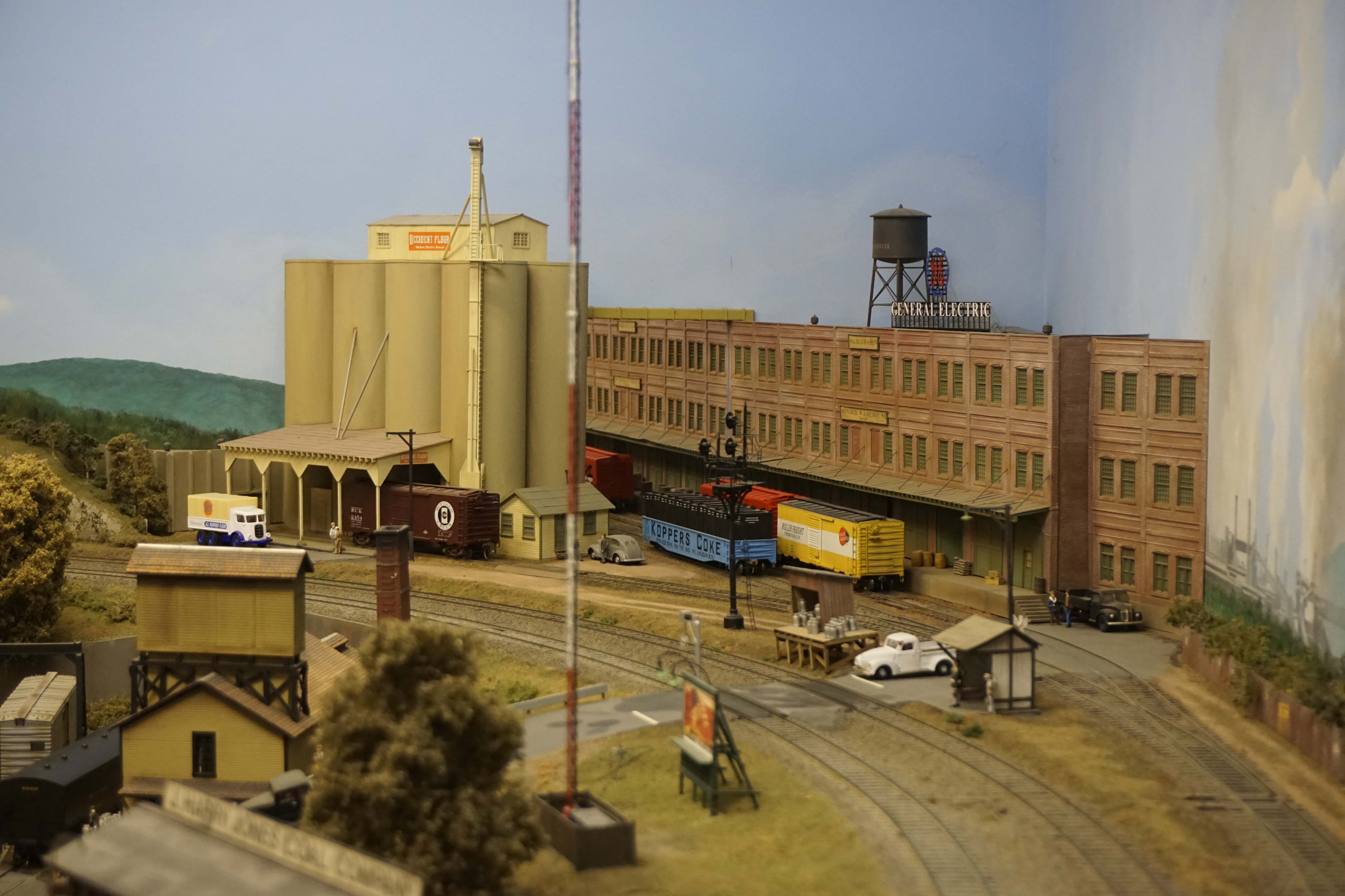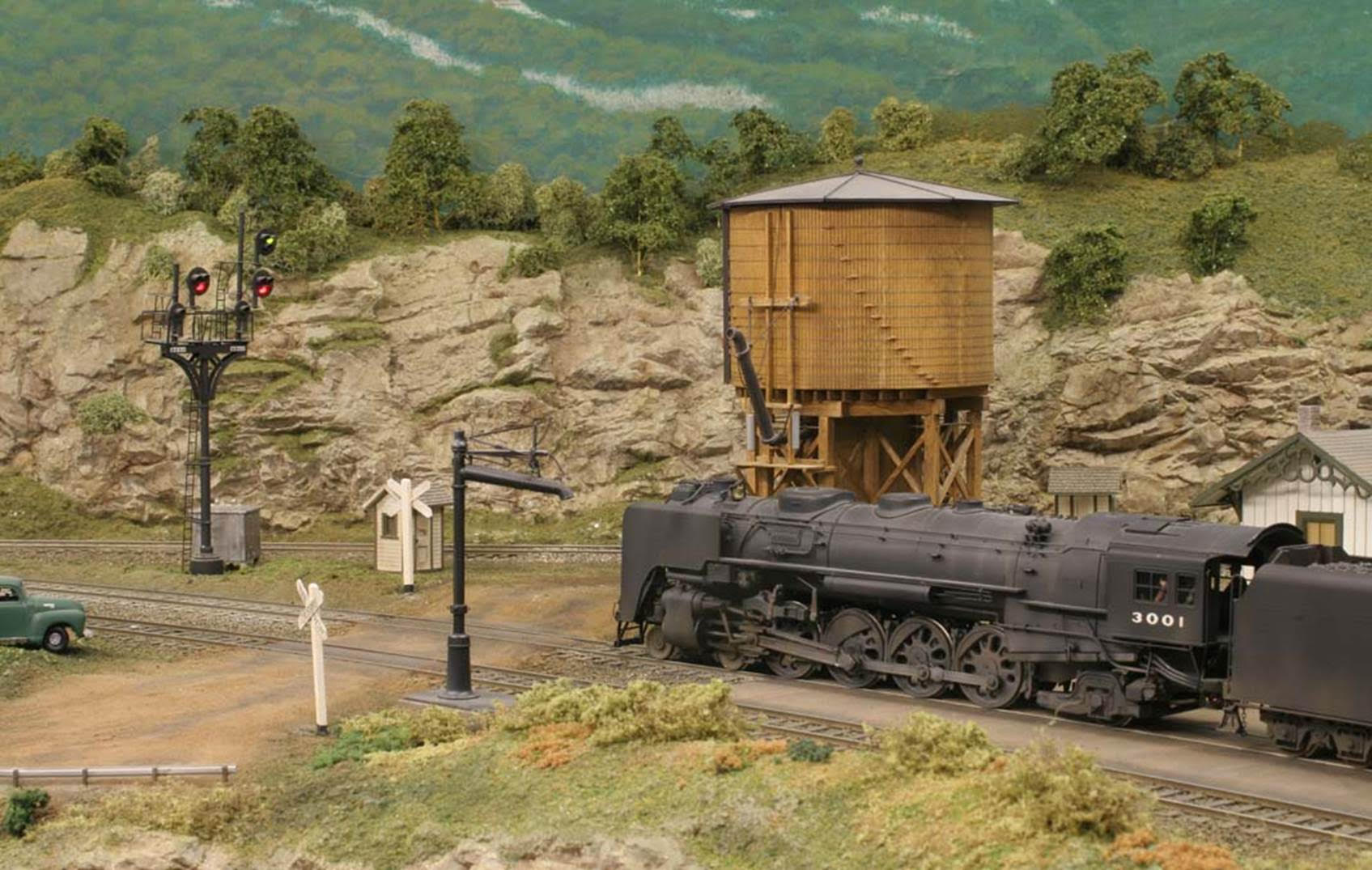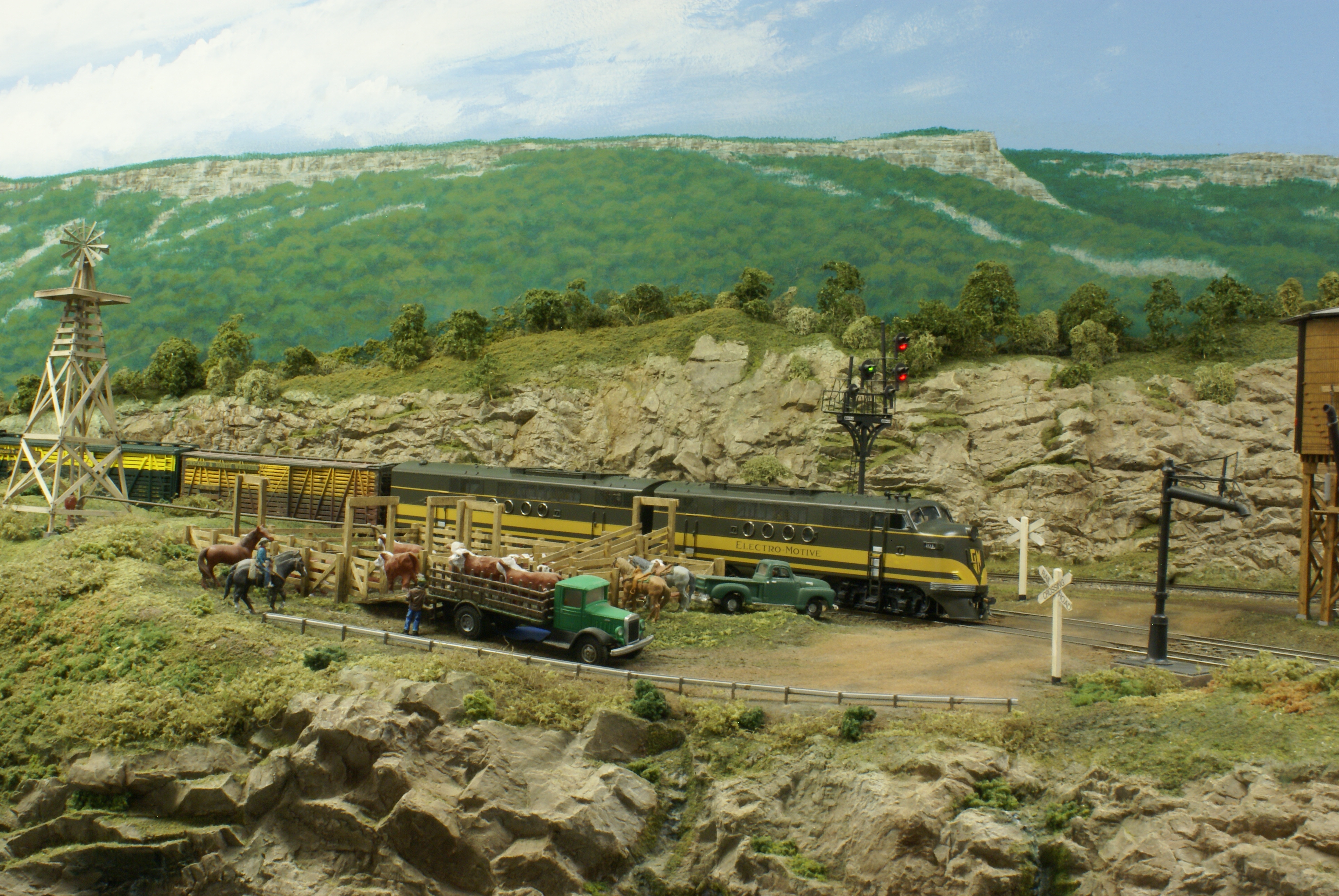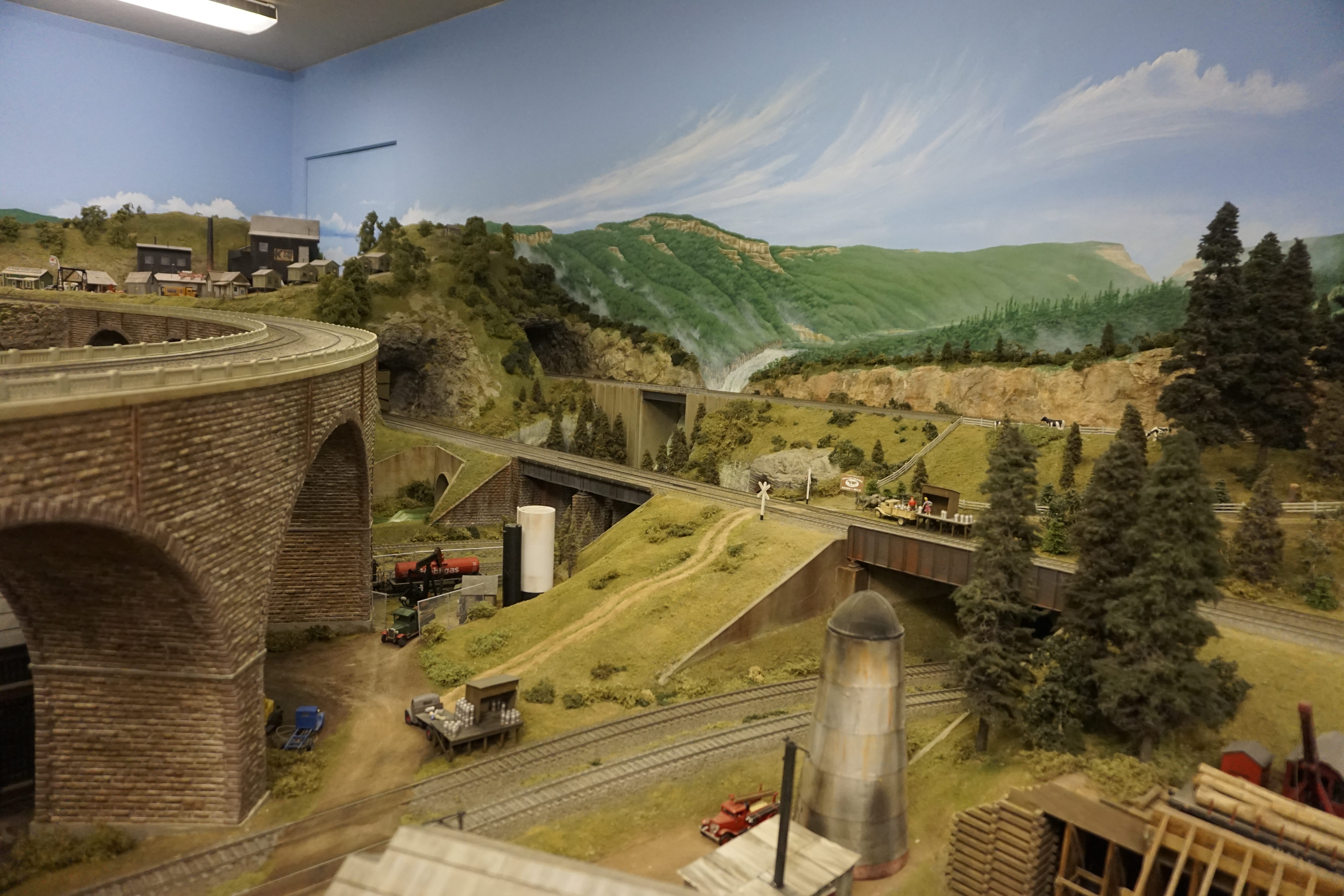 Mike Kotowski gets the credit for the beautiful artwork on the wall. Each of the walls has a masterpiece of his which blends in with the track geometry and structures to provide a wonderful overall impression. This scene also shows a small portion of the sawmill complex, the coal mine area, a dairy farm and the crude oil extraction site – all of which need a railroad for survival. The railing on the large cut stone viaduct is a modified HO highway bridge railing sold by Chooch Enterprises. This is an excellent example of how products intended for other scales can be effectively used on an S scale layout.