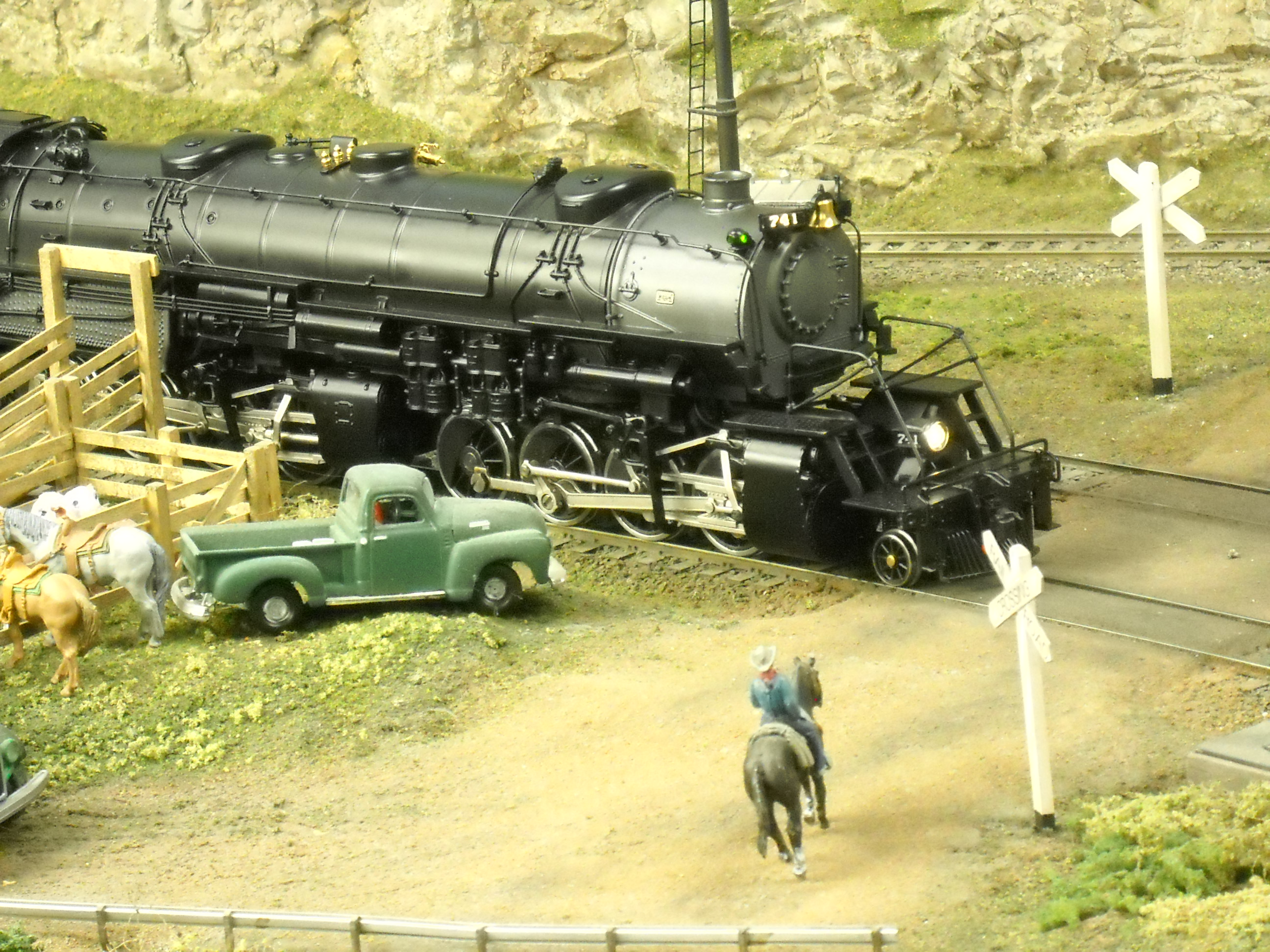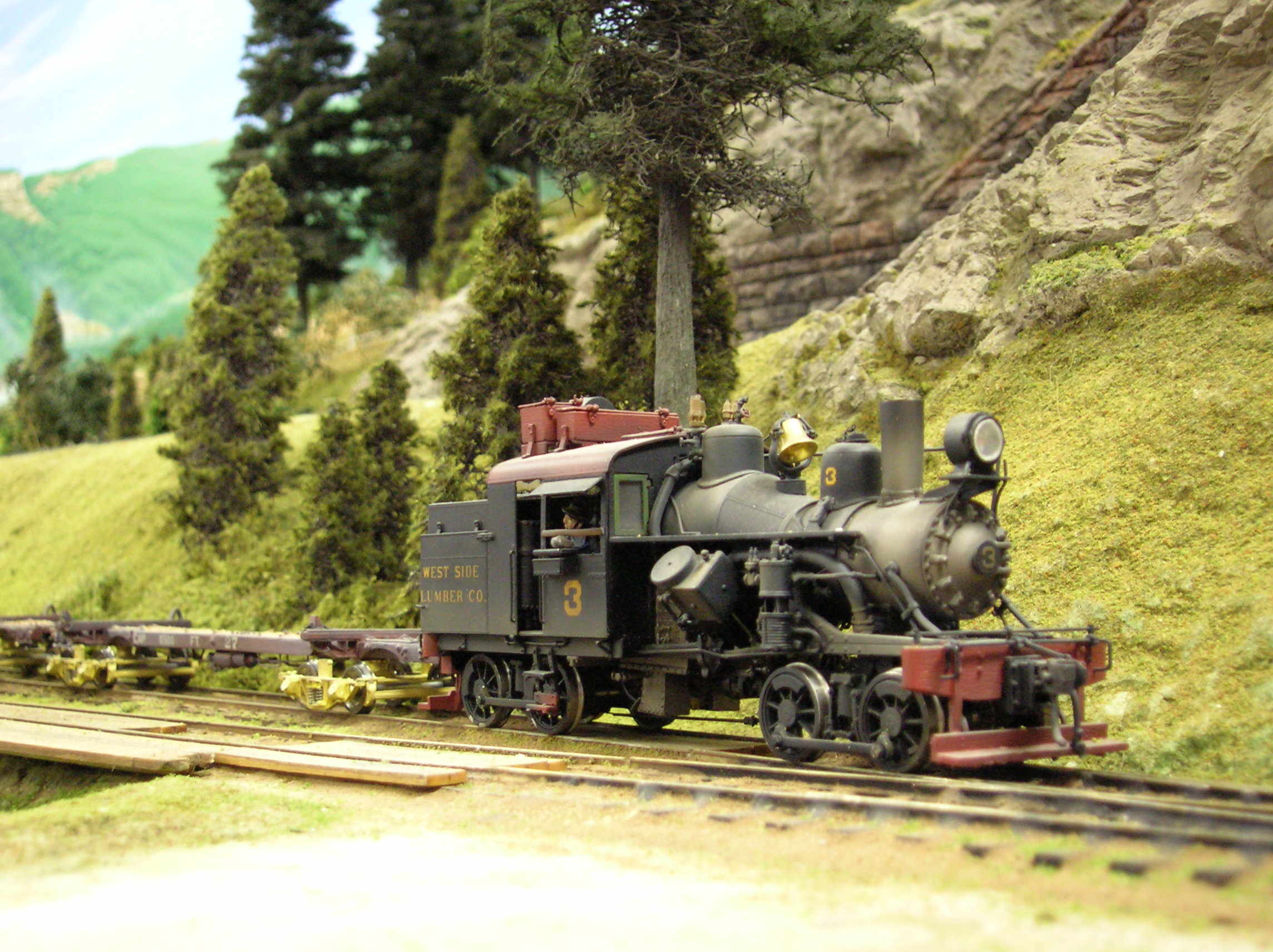 Heisler No. 3 is hauling empty logging “skeleton” cars up to the forest for another load of cut trees to be taken back down to the sawmill. The Westside Lumber Company (WSLCo.) has acquired running rights on NYC trackage (for a fee, of course) which enables it to roam the layout at will. In the alternate history of this area, the Westside Lumber Company got its early beginnings on the west side of the Catskill Mountains in New York State. It was many years later before the WSLCo. moved its operations to California. While logging operations have the look and appeal of a narrow gauge railroad, all rolling stock has standard gauged wheelsets. Thus, the friendly comment: “Ed’s layout is pseudo narrow gauge.” is heard from time to time. Only here can you see a Shay holding the siding while the 20th Century Limited passes by.