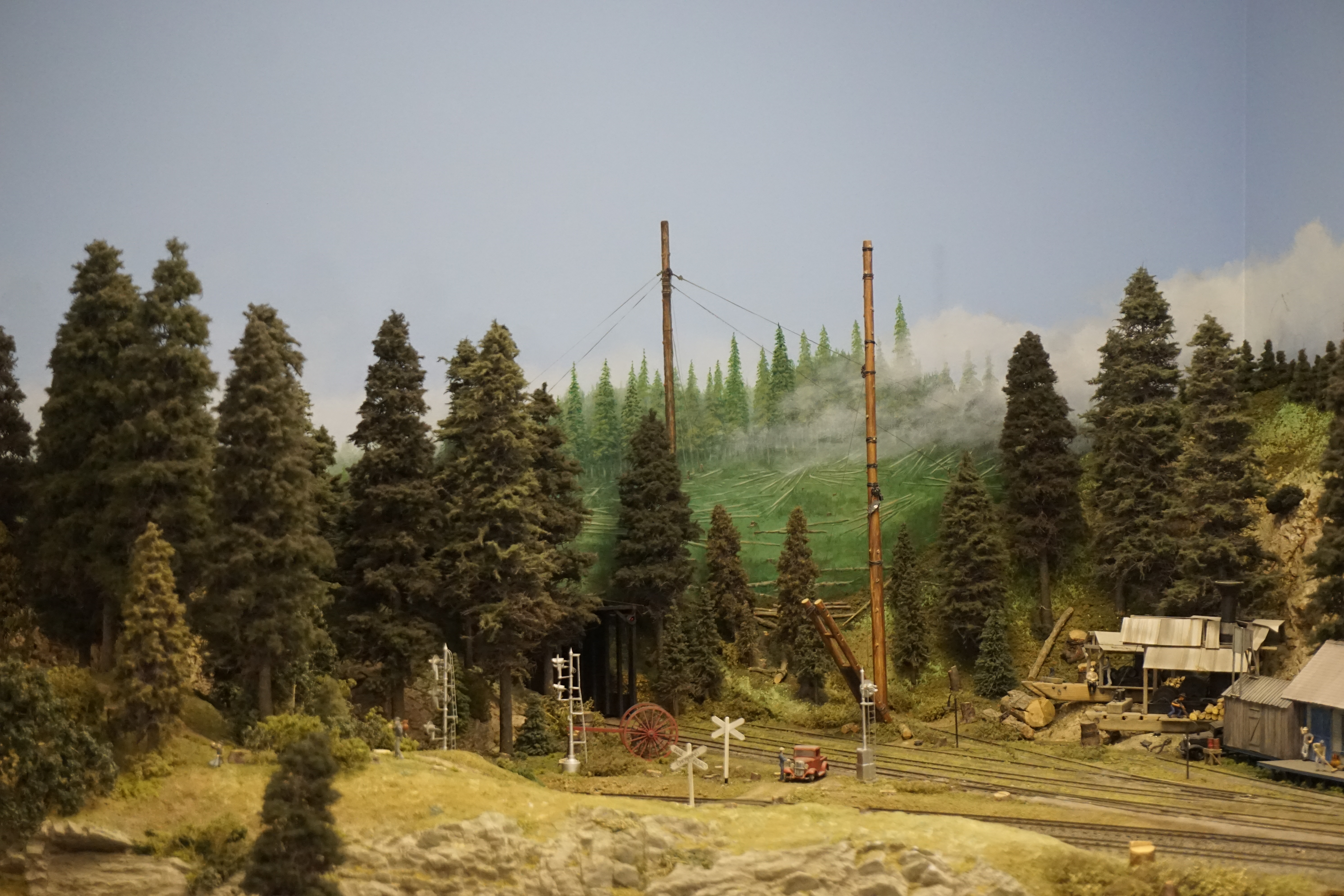 The Foggy Hollow Logging Camp got its name from the fog which drifts into the hollow every early morning before logging activity begins. Professional artist Mike Kotowski did a magnificent job of capturing foggy effects on this backdrop painting. All those fallen trees on the hillside need to be dragged down to the spar pole for loading onto railroad cars for transport down the hill to the sawmill. The foreground spar pole is an actual HO model of a spar pole. The other spar pole is painted on the wall by Mike to increase the apparent size of this logging operation. The beautiful pine trees were individually constructed by Don Ledger and shipped in a box filled with Pine Scent automotive freshener aroma packages.