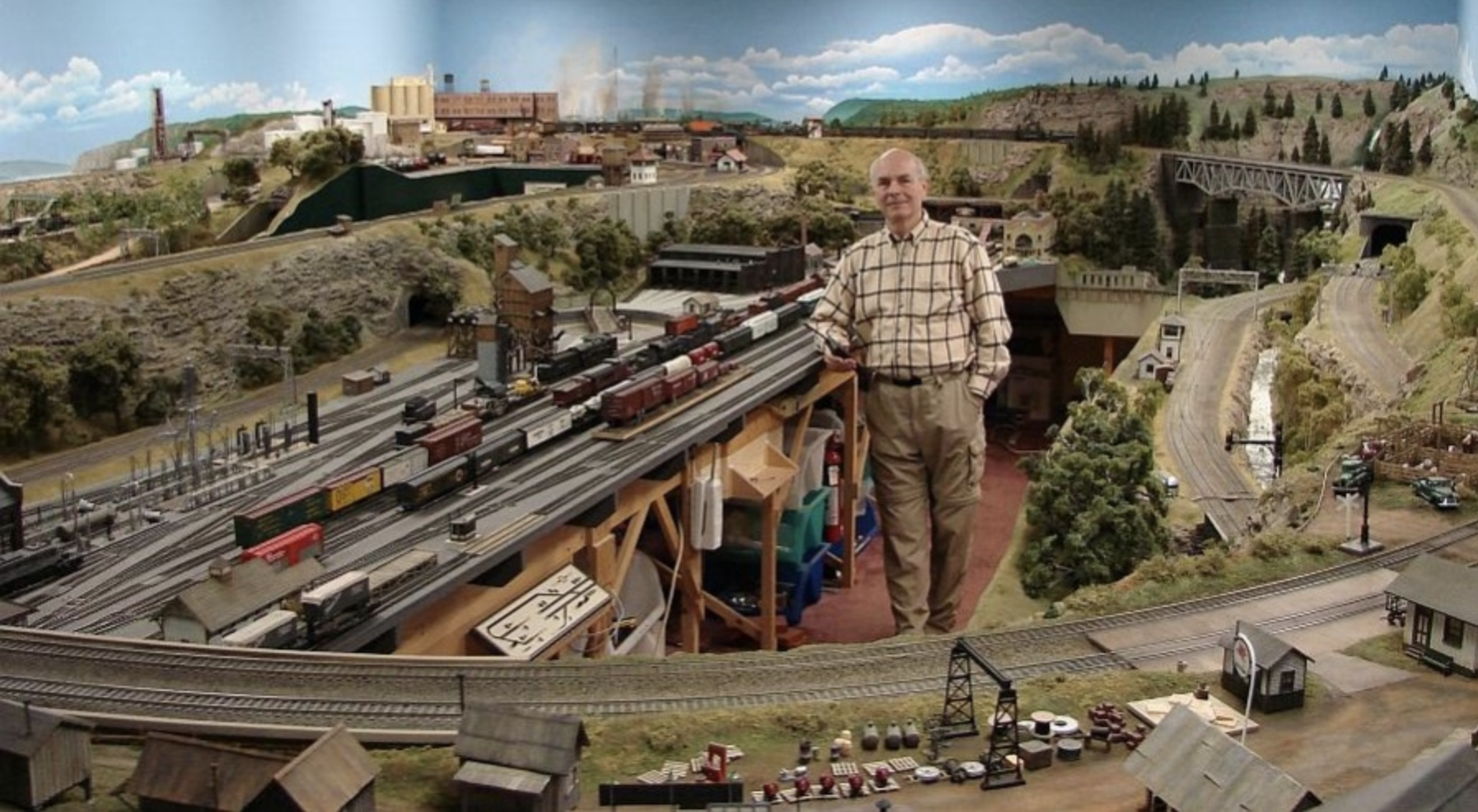 The large silver deck truss bridge was constructed by Don Ledger in cooperation with his friend who works for an engineering firm which designs real railroad bridges. As in the real world, piers are not to be placed in water, but can be located near the water’s edge. A deck truss design was chosen because the distance between the two piers was too great for a girder-based design. Through truss bridges are more expensive to construct than a deck truss (in the real world). The E 72 rating of this bridge was used when determining the dimensions and locations of all members. The high point of this project was when the famous John Armstrong came for a visit during an NMRA convention. He took one look at the bridge and announced, “That’s an E 72!” No one knew what he was talking about, but we all learned within the next five minutes. Don’s bridge has over 6,000 individual pieces of plastic and took about four years of evenings and weekends to complete.