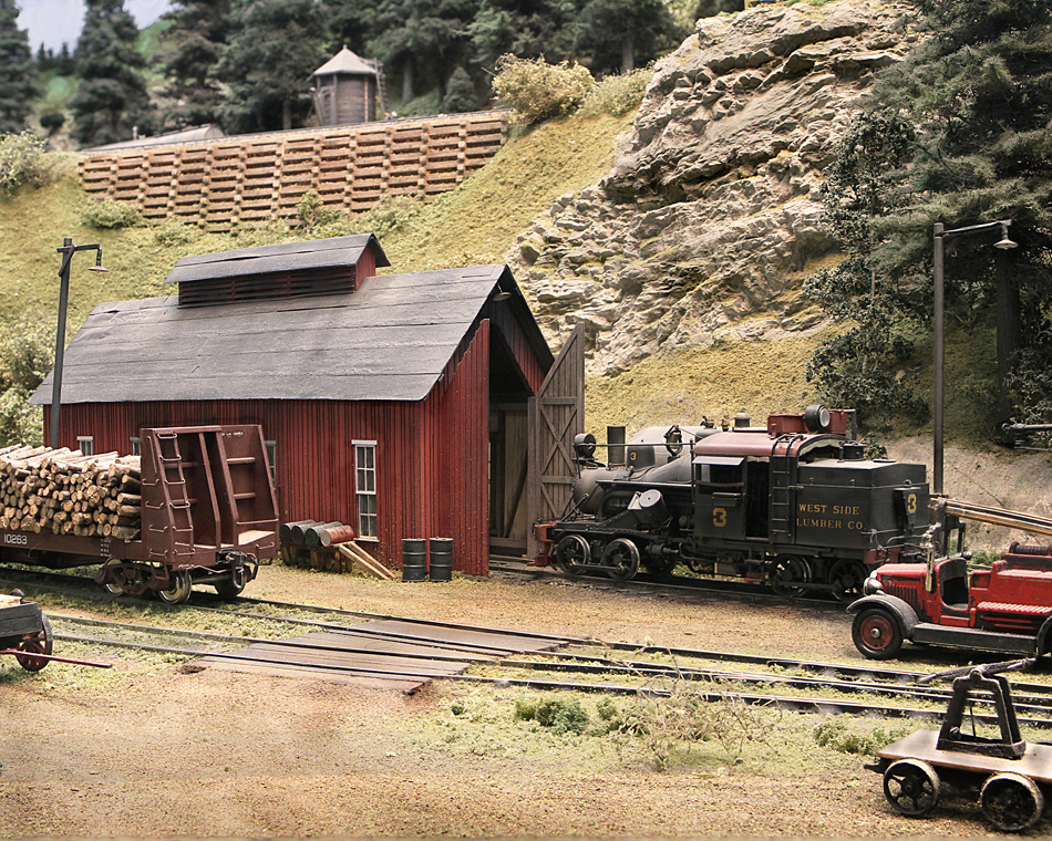 Michael Starkey built the red engine house and all associated logging structures. His enthusiasm for logging was contagious and, as a result, I acquired several logging engines. While this scene may appear to be a narrow gauge operation, it is actually completely standard gauge. The real #3 Heisler was re-gauged during its lifetime and so it is authentically correct.