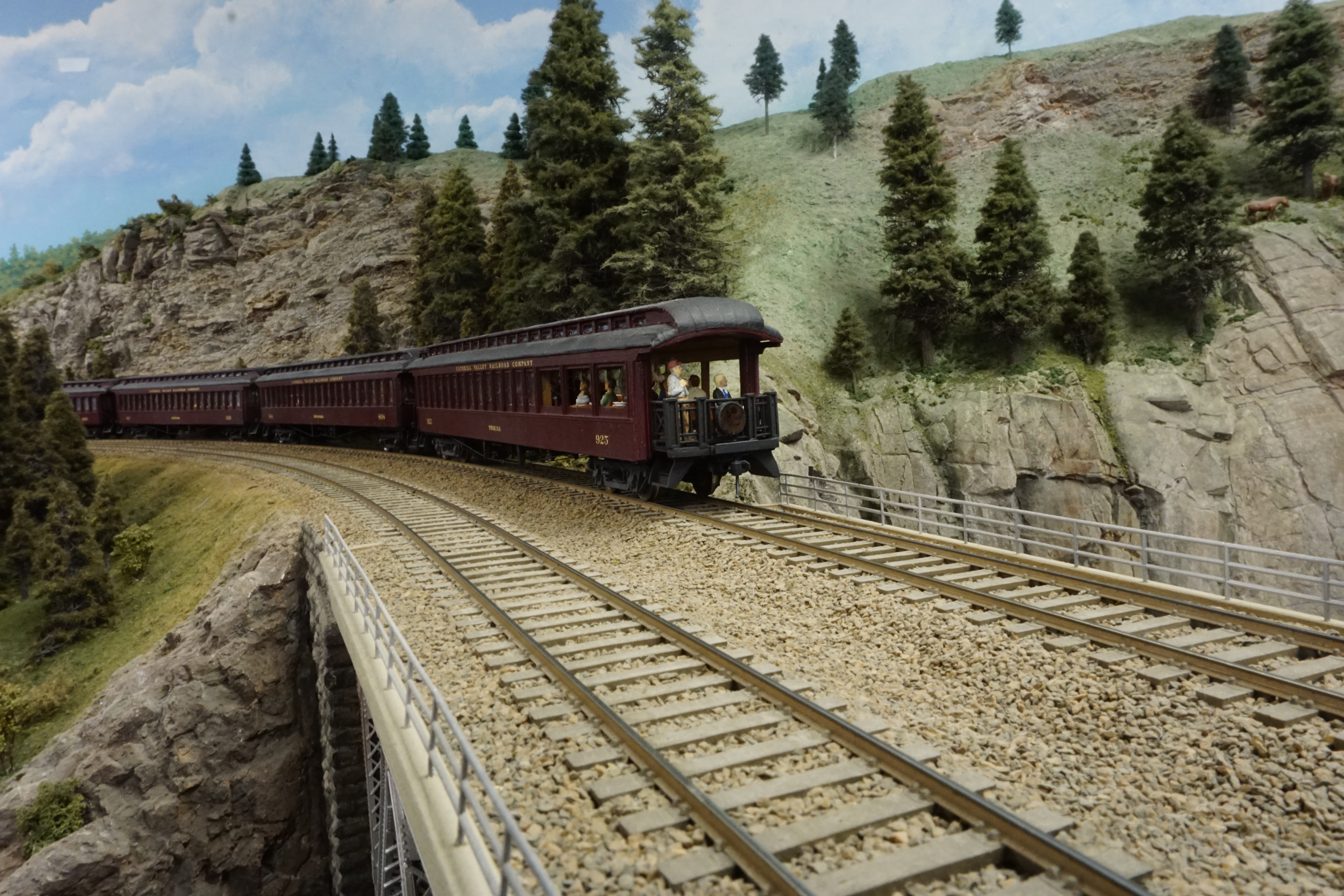 This deep scene is about ten feet from the foreground to the distant mountain. Deep scenes are a bit unusual since most model railroad layouts hug a wall and follow the arm’s length rule which states that everything should be within 24” for easy maintenance purposes. To enhance the illusion of great distance, note the large girder bridge in the foreground and the smaller bridges in the background.