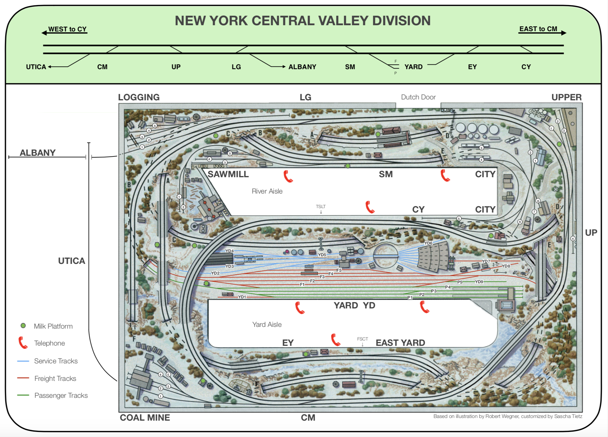 This illustration shows the entire layout including both staging yards. Sascha Tietz spent many hours customizing this diagram to include exact names of locations and the green linear diagram at the top. It is amazing what can be done with superb software and patient talent. Copies of this diagram are given to road crews to help them to figure out where their train will emerge after disappearing into a tunnel. So far we have not lost any train for more than a minute or two.