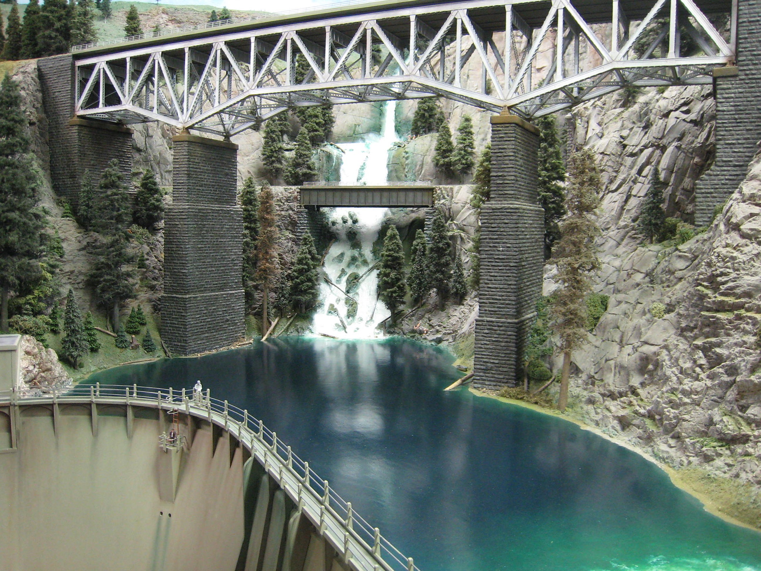 At times, scenery is more impressive than trains. Although static, scenery can be truly beautiful and outstanding – a real piece of art. In this scene, the silver bridge and piers were constructed by Don Ledger using over 6,000 individual pieces of plastic. Some pieces were parts from commercial HO kits while others were scratchbuilt from next to nothing. Mike Kotowski created the waterfall by pouring multiple layers of liquid Gesso at the top and letting it freely run down the hillside seeking its own nooks and crannies. Some layers were whitish, some greenish and some bluish for an interesting overall effect. Notice the green moss only alongside the edges of the waterfall where the water spray dampens the soil. Rock castings by Keith White, pine trees by Don Ledger and a damn fine dam in the foreground by Mike Kotowski. The dam was a most creative project designed and built to prevent lake water from spilling onto the carpet below. A fine solution to a perplexing problem.